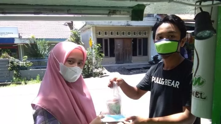 Masker Gratis tersebut dibagikan secara langsung oleh Owner Es Duren Caramel Faisal Amdal beserta pegawainya kepada seluruh costumer yang beli Es Duren Caramel.