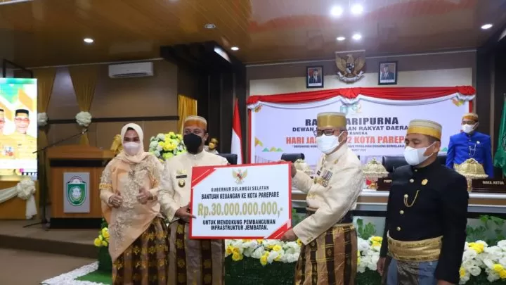 "Kami serahkan bantuan keuangan sebanyak 30 M kepada Pemerintah Kota Parepare dari Pemerintah Provinsi Sulsel, bantuan itu diharapkan bisa digunakan nantinya untuk melanjutkan Proses Pembangunan jembatan lintas jalan Suaka Alam dengan Jalan Lingkar Kota Parepare,"katanya.