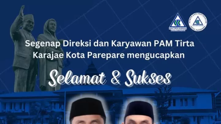 Terkini, Parepare - Segenap jajaran direksi dan karyawan Perusahaan Umum Daerah Air Minum (PAM) Tirta Karajae Kota Parepare mengucapkan selamat dan sukses atas penetapan Tasming Hamid-Hermanto menjadi Wali Kota dan Wakil Wali Kota Parepare terpilih periode 2025-2023.